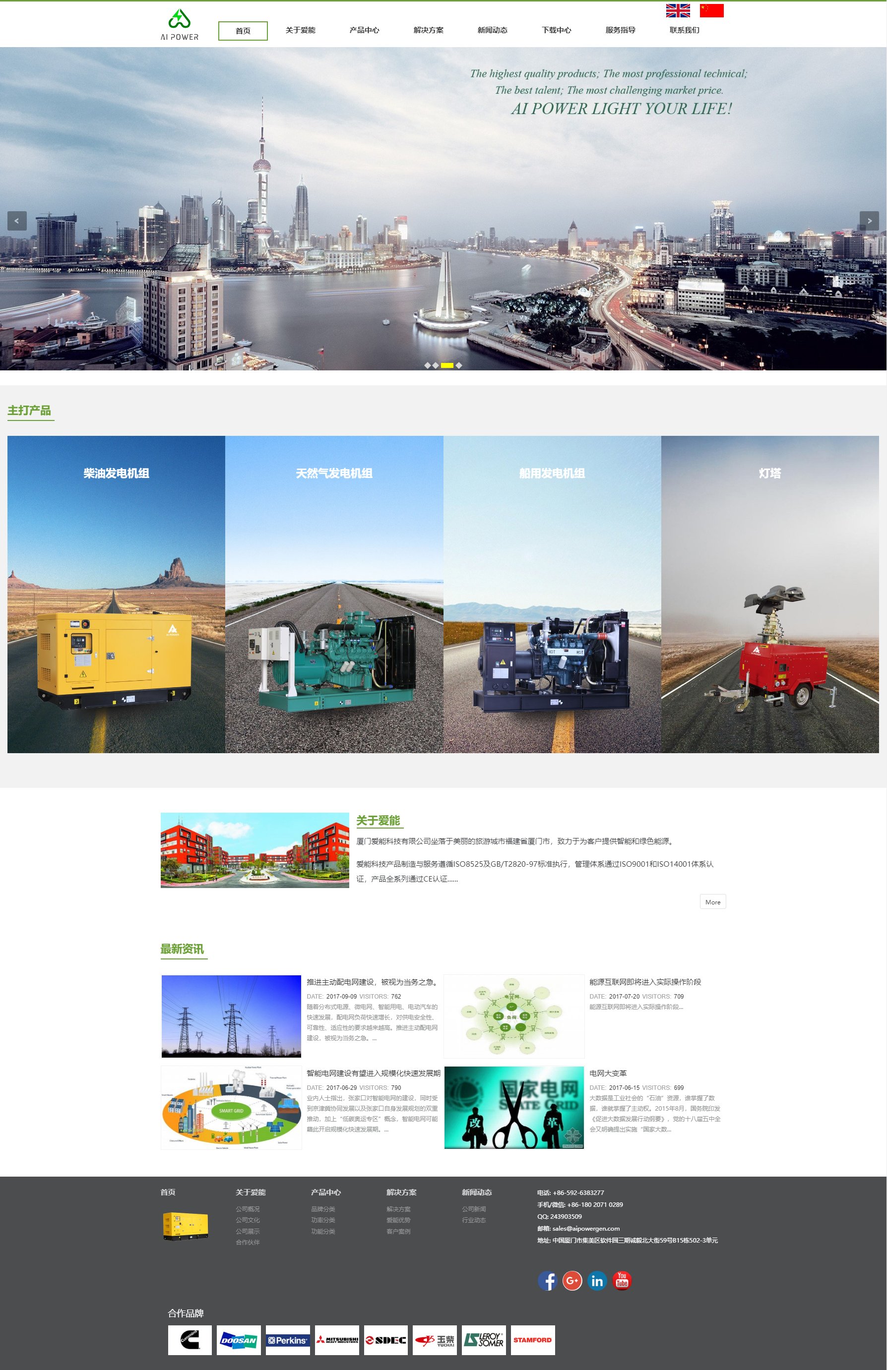 爱能科技产品制造与服务遵循ISO8525及GB/T2820-97标准执行,管理体系通过ISO9001和ISO14001体系认证,产品全系列通过CE认证,从而确保爱能科技高品质的产品与服务。产品范围包括柴油发电机组5KVA~2500KVA;燃气发电机组;船用发电机组;移动便携发电机组;移动灯塔;发电机组配件和其他高增值的机械和电器产品。爱能科技产品以个性化、智能化、环保和高品质为特色。爱能科技产品被广泛应用于建筑、医院、银行、矿山、港口、建筑、数据中心、电站、高压工程等领域。